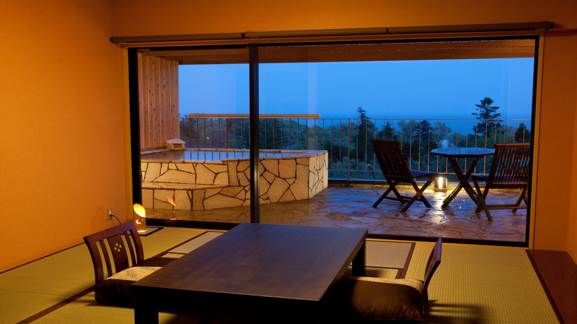 全室オーシャンビューの露天風呂付き客室で、秋の澄んだ空気の中、二人だけの時間を心ゆくまで楽しめます。