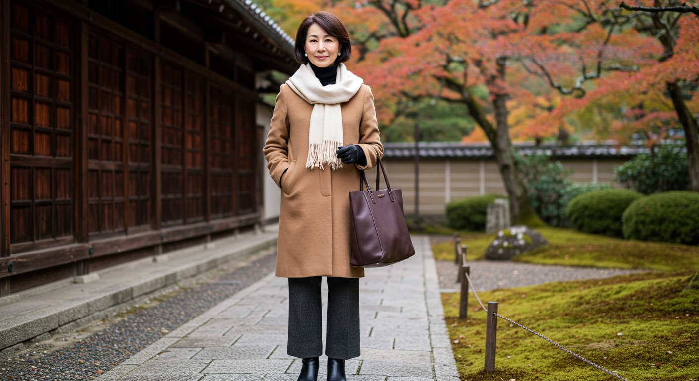 - 小物: 上質なウールやカシミヤのストール、品のあるハンドバッグ、小さめのアクセサリー